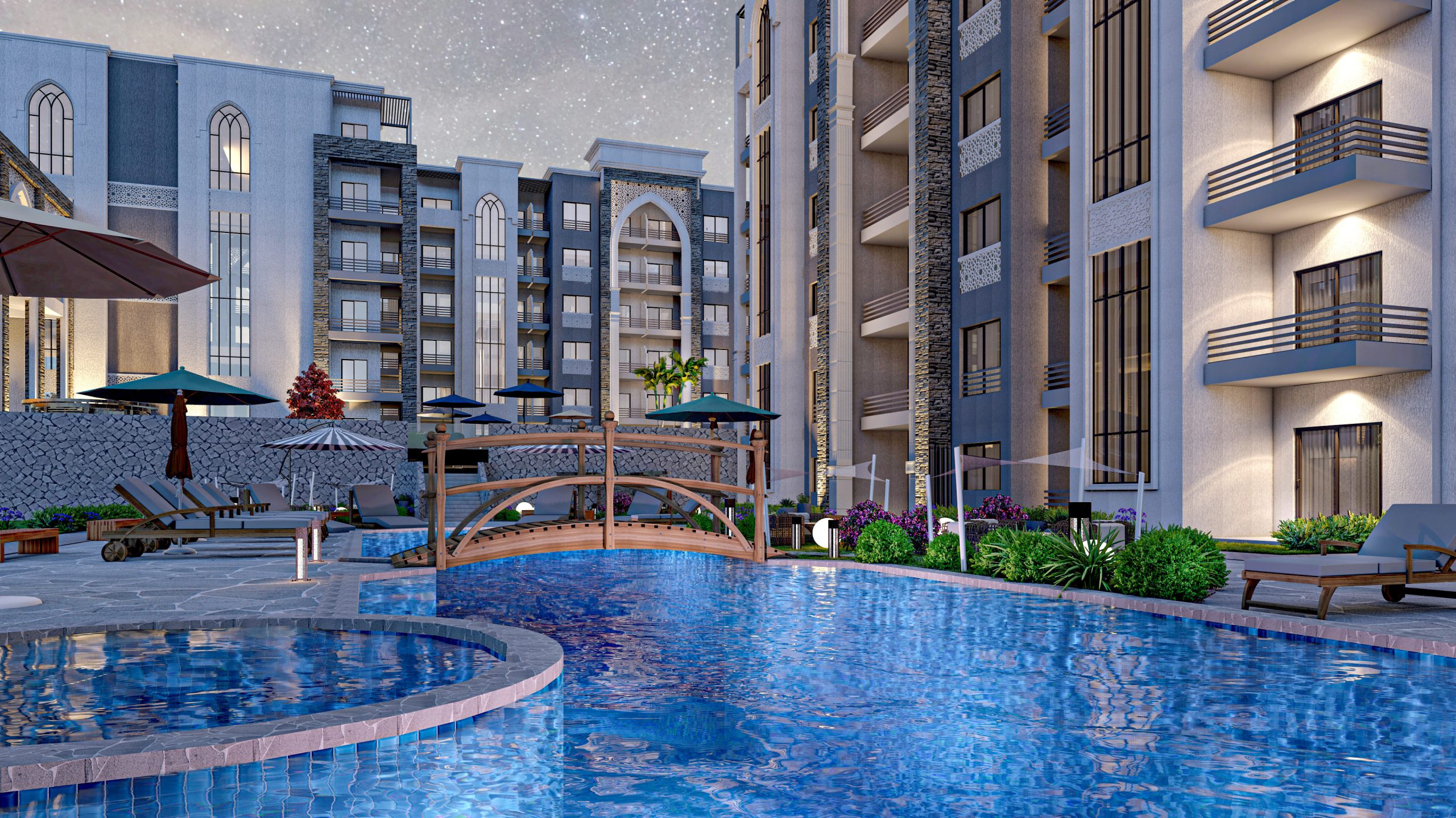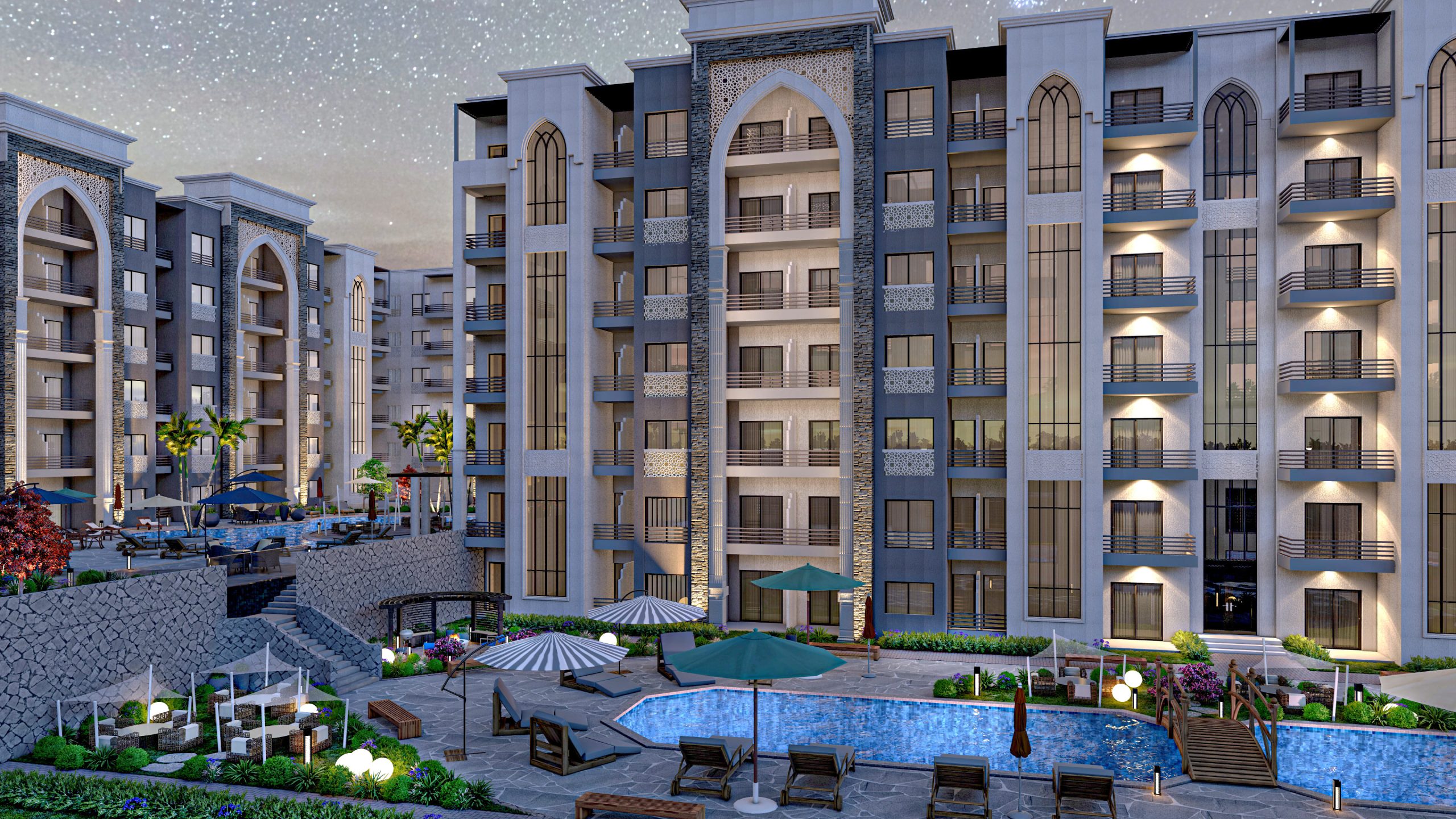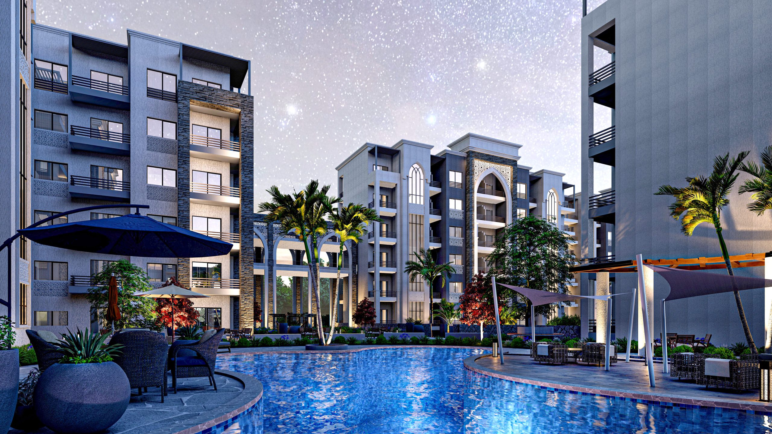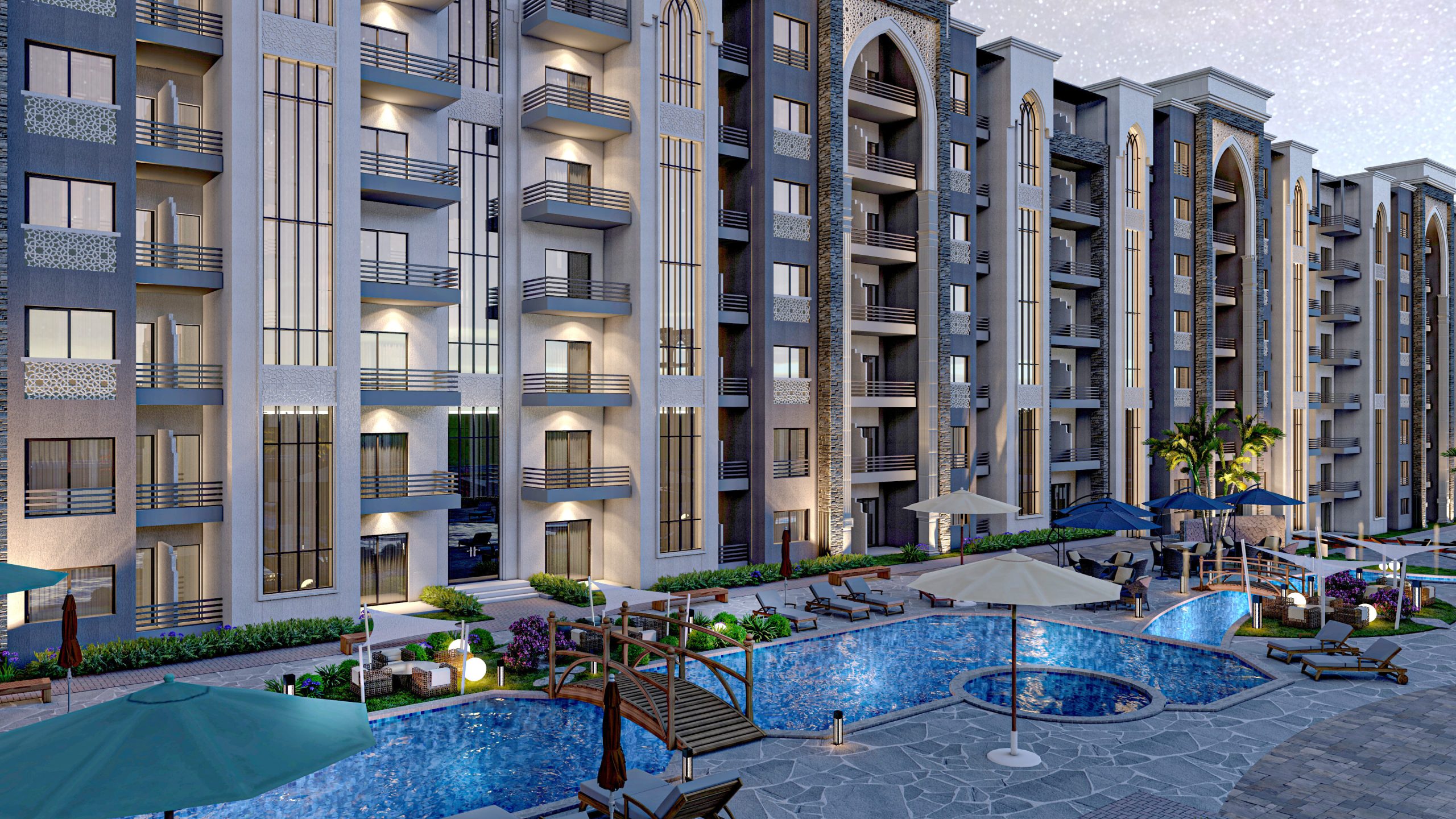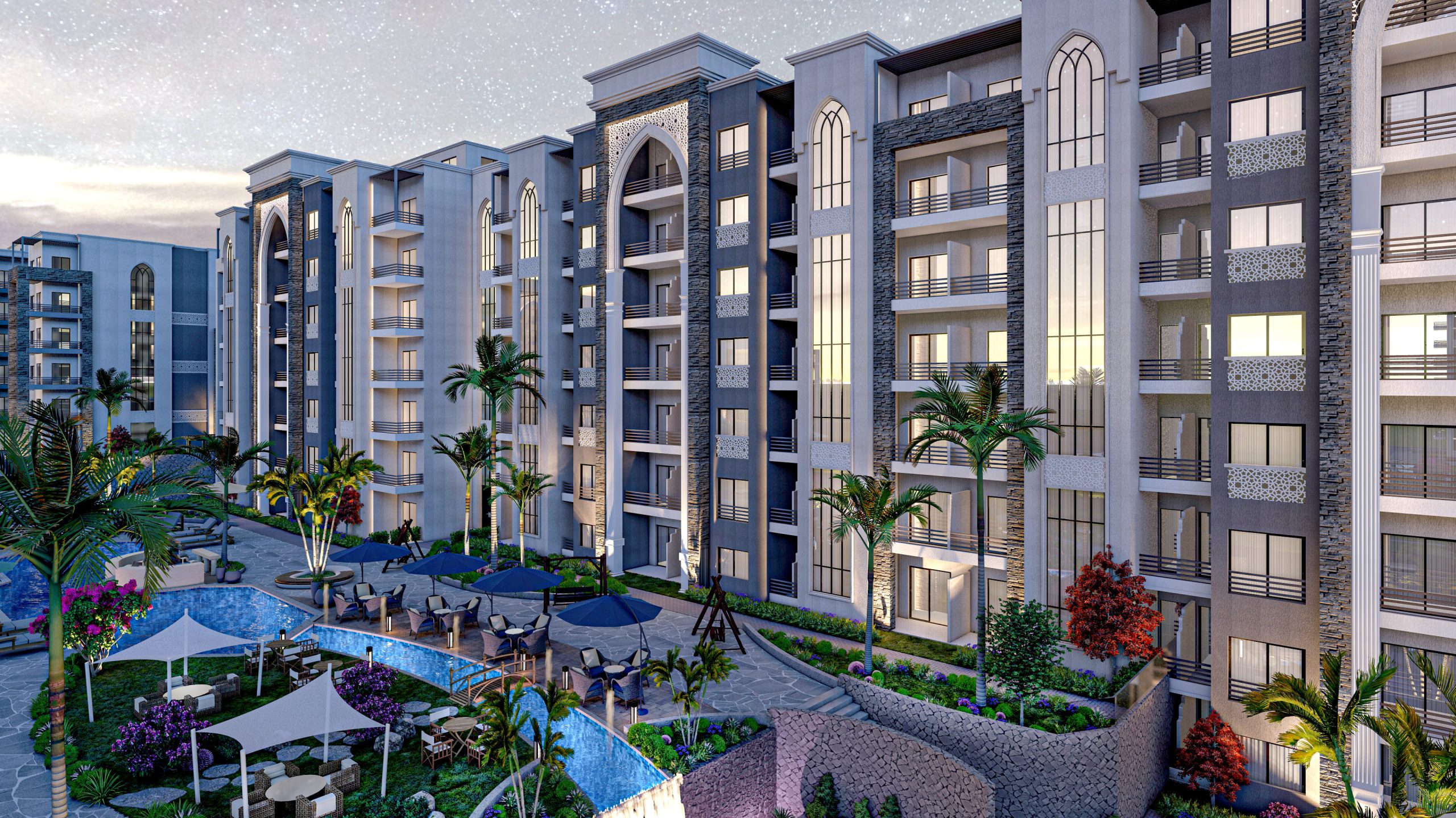 حرصنا على أن يكون تصميم المشروع عصريًا ومريحًا، حيث تم التخطيط لإنشاء مباني على طراز G+7 (أرضي + 7 أدوار) فقط، حتى تتمتع جميع الوحدات بإطلالات بانورامية ساحرة على حمامات السباحة والمساحات الخضراء من جميع الاتجاهات. يضمن لك هذا التصميم توزيعًا مثاليًا للهواء والإضاءة الطبيعية داخل كل وحدة، فتشعر دومًا بالراحة والخصوصية داخل شاليهك.